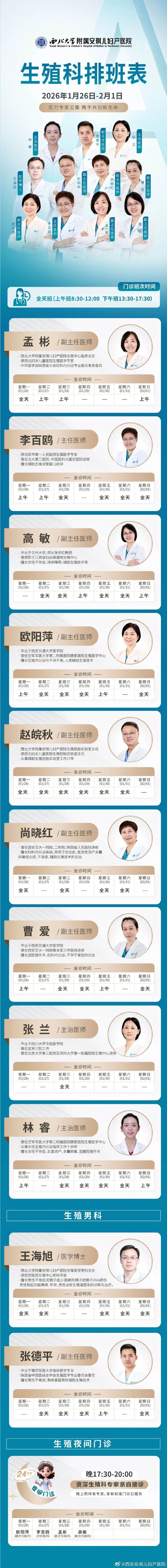 西安安琪儿妇产医院(2025年12月29日至2026年1月4日)专家坐诊时间表