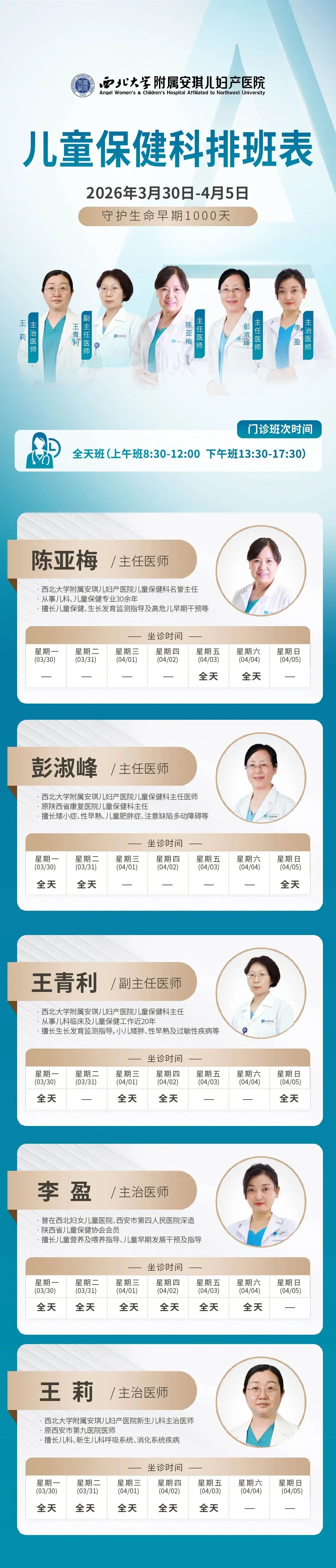 西安安琪儿妇产医院(3月30日至4月5日)专家坐诊时间表